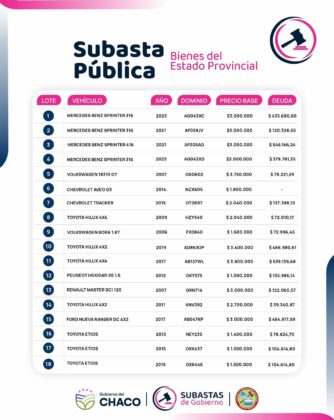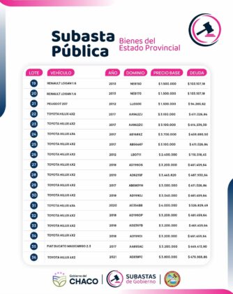 El Gobierno del Chaco anunció una nueva subasta pública de 36 vehículos oficiales, organizada por la Secretaría General que encabeza Carolina Meiriño. El evento se realizará el viernes 14 de noviembre, desde las 9:00 horas, en el Centro de Educación Física N°1 “Miguel Ángel Campos” (avenida Lavalle al 700, Resistencia). Las inscripciones podrán efectuarse ese mismo día desde las 8:00.