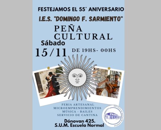 Como cierre del mes de festejos, el sábado 15 de noviembre, desde las 19:00 hasta la medianoche, se llevará a cabo la Peña Cultural Aniversario en el SUM de la Escuela Normal (Donovan 425).