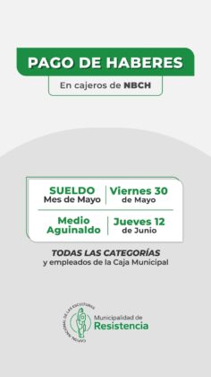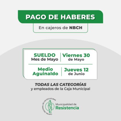 La Municipalidad de Resistencia anunció que este viernes 30 de mayo se abonará el salario correspondiente al corriente mes, junto a los 100 mil pesos en concepto de Refrigerio.