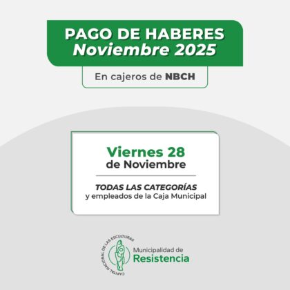 La Municipalidad de Resistencia confirmó que este viernes 28 de noviembre se realizará el pago de los sueldos correspondientes al mes de noviembre para todo el personal municipal. La acreditación alcanzará tanto a los trabajadores de planta permanente y contratada de todas las categorías, como también al personal de la Caja Municipal.