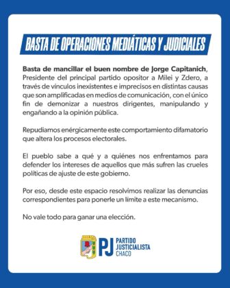 Aseguran que “desde hace semanas se despliega una campaña coordinada, sistemática y altamente financiada contra el candidato Jorge Capitanich en redes sociales, plataformas digitales y medios tradicionales de comunicación”, y detallan links y capturas de algunas de las publicaciones.