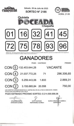En el sorteo N° 2185 realizado este sábado a las 21, no se encontraron ganadores, por lo que el pozo sigue creciendo. Los números sorteados fueron 01, 16, 32, 41, 45, 72, 75, 78, 93 y 96. Aunque nadie acertó los cinco números, 71 jugadores lograron adivinar cuatro cifras y cada uno ganó $ 296.306,65. Además, 1.833 participantes se llevaron $ 2.869,31 por acertar tres números, mientras que 20.558 apostadores recuperaron su apuesta.