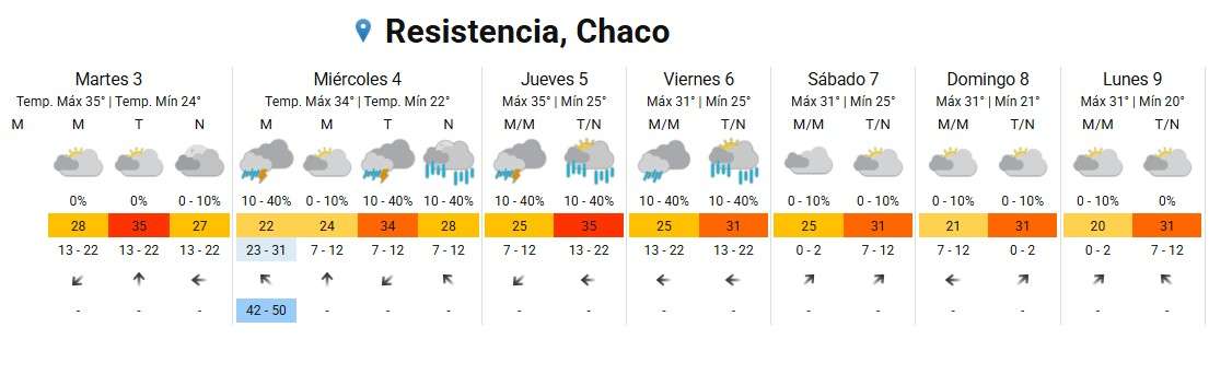 Jueves 5: continuarán las condiciones de lluvia (10-40%) especialmente hacia la tarde y noche, con una máxima nuevamente de 35°C.