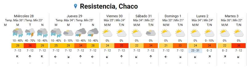 Resistencia atraviesa una semana marcada por las altas temperaturas y condiciones climáticas variables. Para este miércoles 28 de enero, se registra una temperatura actual de 29°C, aunque la sensación térmica ya escala hasta los 33°C debido a una humedad del 63%.