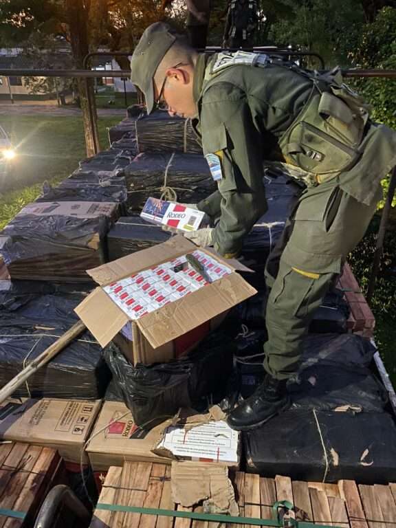 Confirmando las sospechas de los gendarmes sobre la existencia de mercadería de contrabando. Al levantar la lona y, entre la carga de madera, se ocultaba 100.000 atados de cigarrillos de origen extranjero equivalentes a 10.000 cartones sin aval aduanero que acredite su legal tenencia.