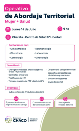 Con el firme compromiso de garantizar el derecho a la salud y acercar el sistema sanitario a cada rincón del territorio, el Gobierno del Chaco llevará adelante dos operativos “Mujer + Salud” en la ciudad de Charata, este lunes 14 y el jueves 17 a partir de las 9 Hs.