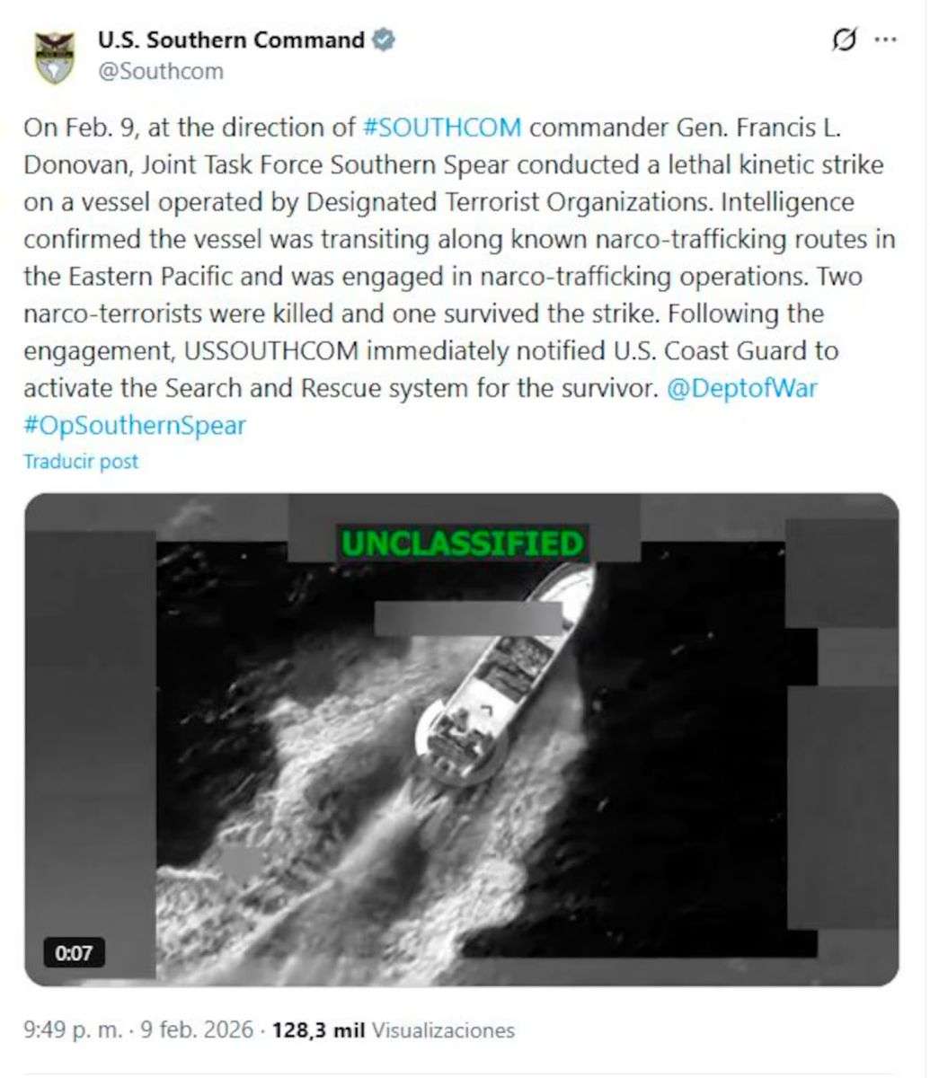 El Comando Sur de Estados Unidos anunció este lunes el ataque contra una lancha supuestamente vinculada al narcotráfico en aguas internacionales del Pacífico. Durante el operativo, dos tripulantes murieron y otro logró sobrevivir.