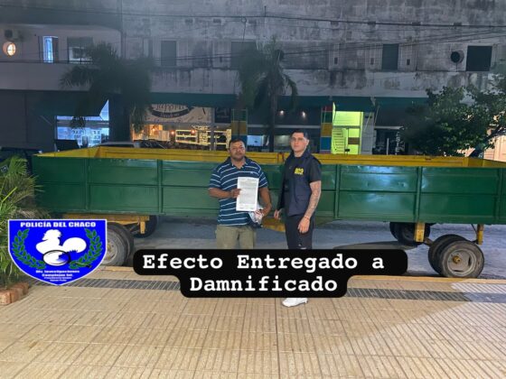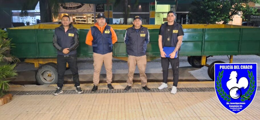 Continuando con la investigación, los agentes se dirigieron a un campo ubicado en el Lote 27 de la colonia Pampa Napenay, a unos 26 kilómetros de la ciudad, donde hallaron el acoplado —ahora pintado de color verde—. El damnificado reconoció el acoplado como de su propiedad.