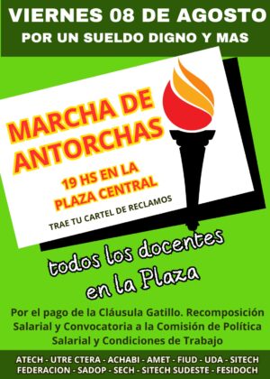 El Arco Gremial Docente de la provincia del Chaco anunció la realización de una marcha de antorchas para este viernes a las 19 horas en todas las plazas centrales del territorio provincial. La medida se enmarca en el plan de lucha iniciado tras el receso invernal, motivado por el incumplimiento del pago de la cláusula gatillo por parte del Gobierno provincial.
