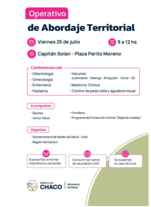 Este viernes 25 de julio, de 9 a 12 horas, el gobierno provincial llevará a cabo un nuevo Operativo de Abordaje Territorial en la Plaza Perito Moreno de la localidad de Capitán Solari, con múltiples servicios de salud y acompañamiento integral para la comunidad.