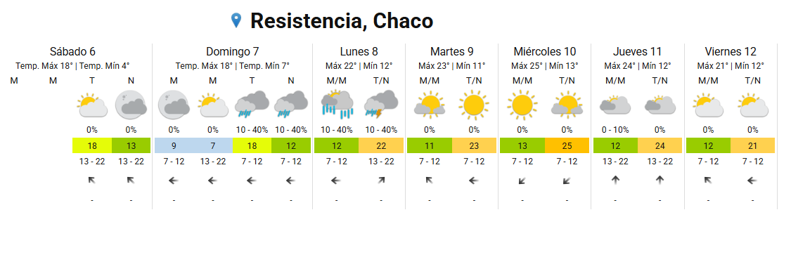 De acuerdo al informe del SMN, este sábado 6 de septiembre la ciudad de Resistencia amaneció con cielo ligeramente nublado y una temperatura mínima de 4°C. Para la jornada se espera una máxima de 18°C, con viento del sector sudoeste a 8 km/h.