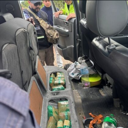 El vehículo, conducido por C.L.Z.(43) y acompañado por F.M.G. (32), los que fueron demorados; y ante la presunción de irregularidades en la mercadería transportada, se solicitó la colaboración de la División Microtráfico Metropolitana y la intervención del can detector Antinarcóticos «Lulú», quien marcó interés en el sector del asiento trasero.