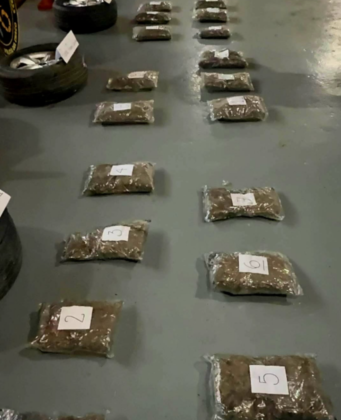 Por orden judicial el vehículo fue trasladado al Departamento de Logística, donde se inspeccionó con mayor precisión. Se hallaron 25 paquetes sellados de nylon transparente que contenían 26,789 kilos de cogollos de marihuana.