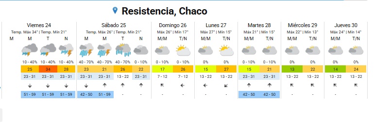 No obstante, para la ciudad de Resistencia, se prevén lluvias durante toda la jornada y hasta el día sábado. Con una temperatura máxima de 34 grados.