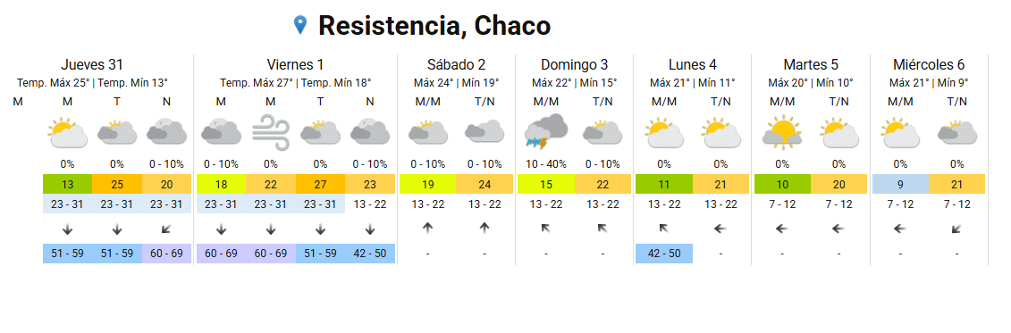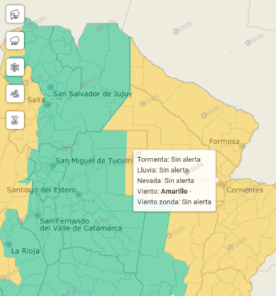 El Servicio Meteorológico Nacional, emitió un alerta amarillo para toda la provincia del Chaco. Según indica el informe, el área será afectada por vientos del norte o noreste, con velocidades entre 25 y 40 km/h y ráfagas que pueden alcanzar los 60 km/h, pudiendo ser superados de forma puntual. El fenómeno se daría entre la noche de este jueves y la mañana del viernes.