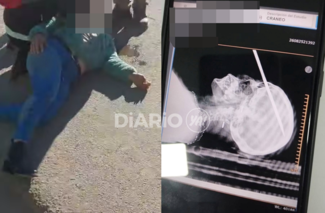 La mujer sobrevivió de milagro: la radiografía realizada poco después del ingreso muestra el hierro aún incrustado en su cabeza, una imagen impactante que da cuenta de la violencia del ataque.