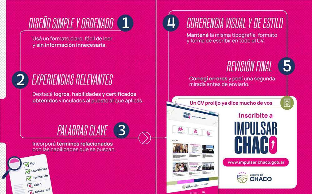 El Gobierno del Chaco continúa fortaleciendo las políticas públicas de empleo y acompañamiento a personas que se encuentran en búsqueda laboral, a través del programa Impulsar Chaco, que difundió una serie de recomendaciones para la correcta elaboración y registro del currículum vitae (CV).