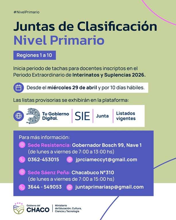 El Ministerio de Educación, a través de las Juntas de Clasificación de Nivel Primario con sedes en Resistencia y Presidencia Roque Sáenz Peña, correspondientes a las Regiones Educativas 1 a 10, informó que desde este miércoles 29 de abril y por el término de 10 días hábiles se lleva adelante el período de tachas para los docentes inscriptos en el período extraordinario de interinatos y suplencias 2026.