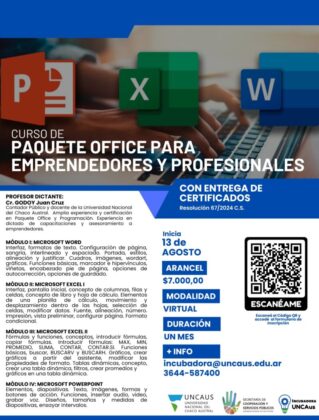 La propuesta está aprobada por Resolución Nº 67/2024- C.S. de la Universidad y contiene cuatro módulos de trabajo. Los mismos serán dictados por el contador público y docente de la Universidad Nacional del Chaco Austral, Juan Cruz Godoy. Además, posee una amplia experiencia y certificación en paquete office y programación; experiencia en dictado de capacitaciones y asesoramiento a emprendedores.