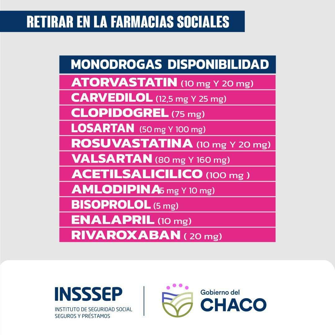 Para consultas sobre horarios o requisitos, se recomienda comunicarse directamente con las farmacias sociales o a través de los canales oficiales del INSSSEP.