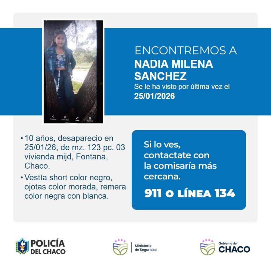Se trata de Nadia Milena Sánchez, de 10 años, quien mide aproximadamente 1,50 metros, es de contextura delgada, tez morena, cabello largo castaño oscuro y ojos negros. Al momento de ausentarse vestía un short negro, remera negra con blanco y ojotas color moradas.