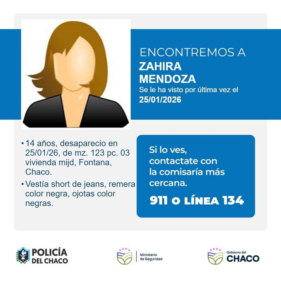 La otra menor es Zahira Mendoza, de 14 años, de 1,60 metros de altura, contextura física robusta, tez morena, cabello largo negro. Vestía un short de jeans, remera negra y ojotas negras.