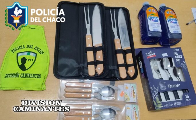 Agentes de la División Caminantes fueron alertados por personal del local, quienes habían observado al sospechoso guardar mercadería entre sus ropas. Al salir del negocio, fue interceptado y se le secuestraron dos jabones líquidos, un juego de 16 piezas de cubiertos, dos juegos de cubiertos comunes y un set de cubiertos de asador.