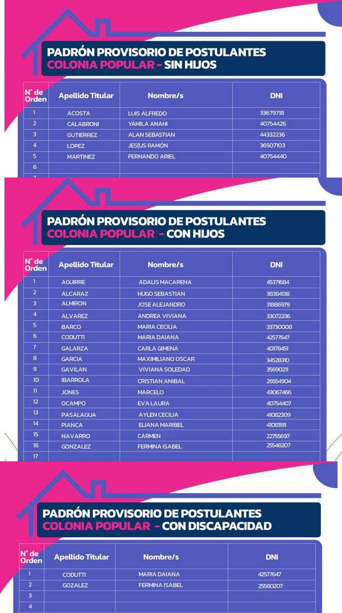 El Instituto Provincial de Desarrollo Urbano y Vivienda publicó el padrón provisorio de postulantes a viviendas en la localidad de Colonia Popular, correspondiente a las familias habilitadas para participar de un próximo sorteo público.