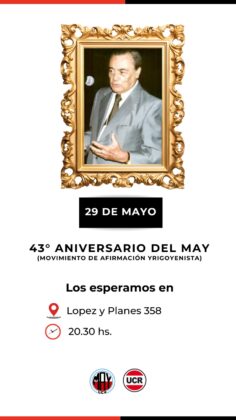 El próximo 29 de mayo, el Movimiento de Afirmación Yrigoyenista (MAY) conmemorará su 43° aniversario con un acto institucional en la Casona de la UCR nacional ubicada en la ciudad de Resistencia, a partir de las 20:30 hs.