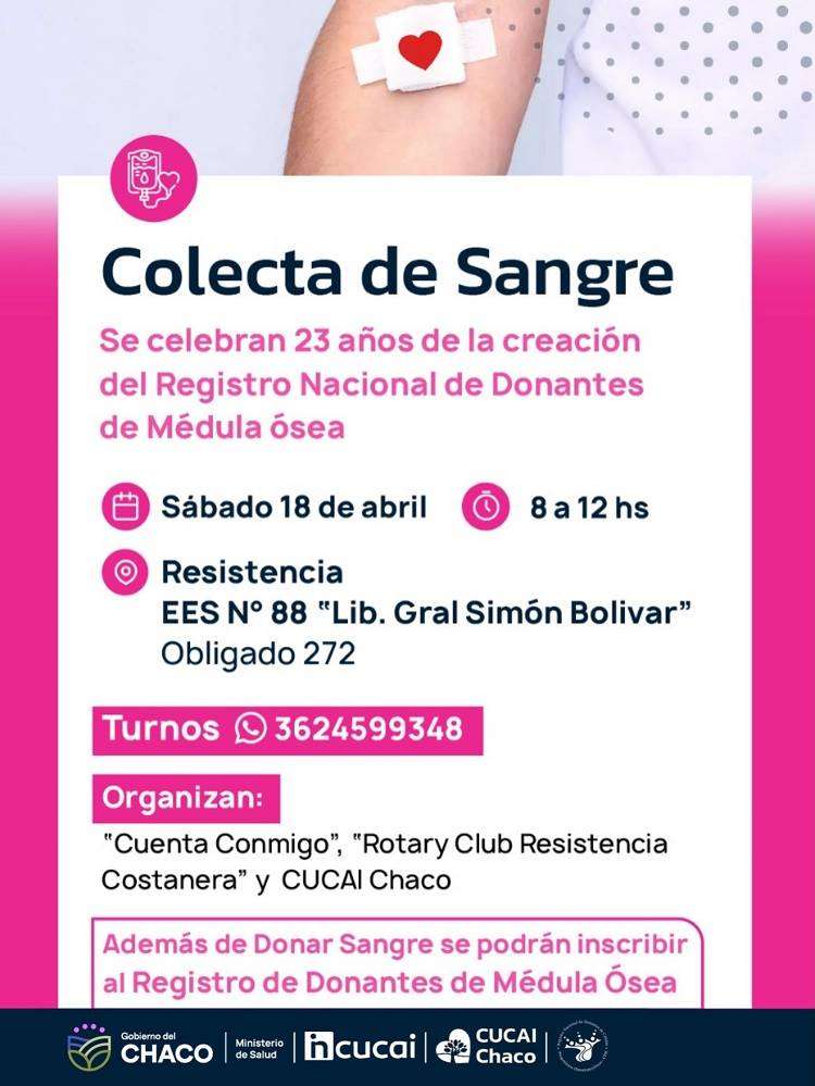Este sábado 18 de abril se realizará una colecta de sangre en la ciudad de Resistencia, en el marco de la celebración por los 23 años de la creación del Registro Nacional de Donantes de Médula Ósea.