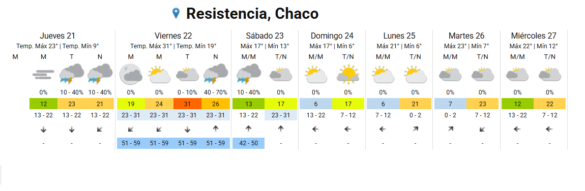 El pronóstico del tiempo indica, para Resistencia, que este jueves por la mañana, se observa la presencia de neblina y una temperatura que llegará a los 23 grados. Por la tarde y la noche, se advierten posibles tormentas a pesar de que las probabilidades son bajas.