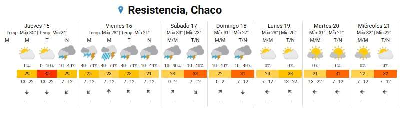 El panorama cambiará drásticamente a partir de la madrugada del viernes 16. Se anticipa un sistema de lluvias y tormentas que afectará a la capital chaqueña durante toda la jornada, con probabilidades de precipitación de hasta el 70% en algunos tramos.