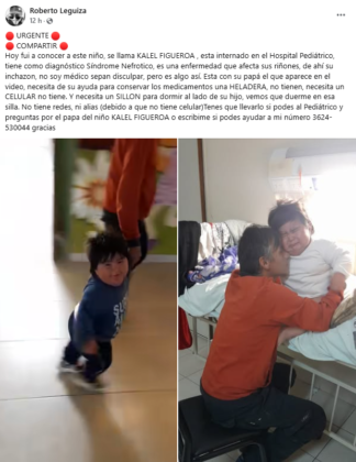 Kalel Figueroa es un pequeño paciente que lucha día a día contra una dura enfermedad: fue diagnosticado con Síndrome Nefrótico, una afección que compromete gravemente el funcionamiento de sus riñones. Actualmente se encuentra internado en el Hospital Pediátrico “Avelino Castelán” de Resistencia, acompañado por su papá, quien tiene que permanecer junto a él las 24 horas.
