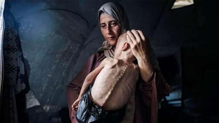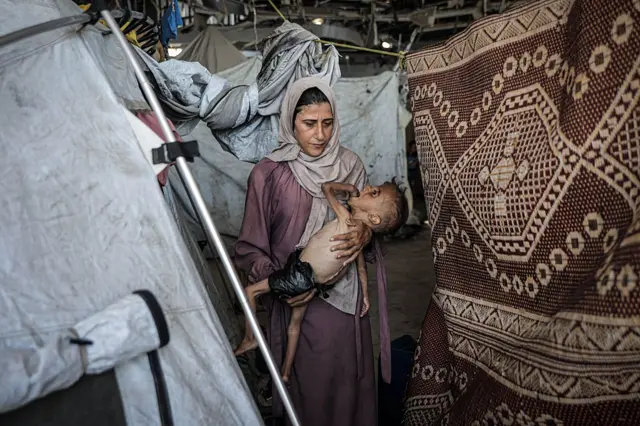 La imagen de Mohamed Zakariya Ayyoub al-Matouq, un bebé de un año y medio severamente desnutrido, junto a su madre Hedaya al-Muta, se convirtió en un símbolo del hambre extremo en Gaza. Fue tomada por el fotógrafo Ahmed al-Arini el 21 de julio en una tienda de campaña.