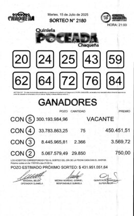 En el sorteo N° 2180 de la Quiniela Poceada Chaqueña, llevado a cabo el martes 15 de julio de 2025, el pozo millonario de $ 300.193.984,96 correspondiente a los cinco aciertos no fue reclamado. Como resultado, el monto estimado para el próximo sorteo se eleva a $ 431.951.051,64.
