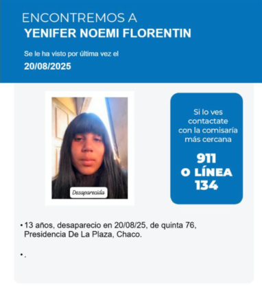 Desde ese momento, su familia, allegados y la Policía del Chaco, la buscan, aún sin resultado. Por ello, la Fuerza provincial solicita colaboración de la ciudadanía para poder dar con la menor. «Necesitamos de tu ayuda, si la viste, sabés donde está o cualquier dato que tengas sobre ella, comunícate con nosotros al servicio de Emergencia 911 o avisá en la comisaría más cercana a tu domicilio», dista el mensaje de los efectivos.