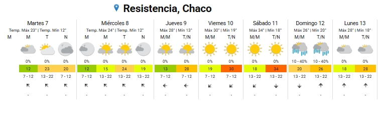 El pico de calor se sentirá durante el sábado, cuando se espera una mínima de 18 grados y una máxima de 34, configurando así una jornada calurosa, típica de la primavera chaqueña.