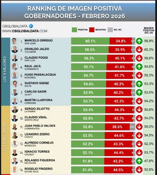 La consultora CB Consultora Opinión Pública dio a conocer su Ranking de Imagen Positiva de Gobernadores correspondiente al mes de febrero de 2026. El informe revela un mapa político donde la aprobación ciudadana premia la gestión territorial, con variaciones marcadas en los extremos de la tabla.