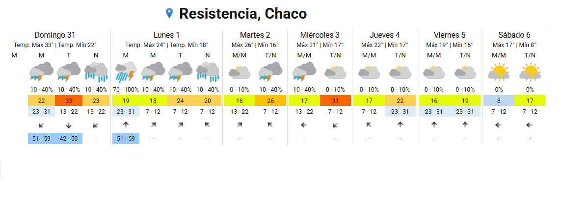 Ya el martes, se espera una mínima de 16 °C y una máxima de 26 °C, con lluvias y tormentas durante la tarde noche que se prolongarían hasta la mañana del miércoles, día que se anticipa como el de mayor amplitud térmica de la semana, con temperaturas que oscilarán entre los 17 °C y los 31 °C.