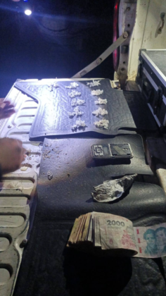 Durante la requisa, uno de los jóvenes portaba entre sus prendas una bolsa de polietileno negra, en cuyo interior se hallaron 126 envoltorios con una sustancia blanquecina, presuntamente cocaína, una balanza digital de precisión, y una suma de $110.000 en efectivo.