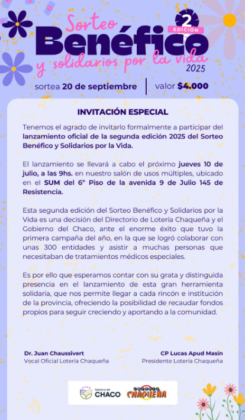 El Directorio de Lotería Chaqueña, a través de la Dirección de Juegos Especiales, anuncia oficialmente el lanzamiento de la segunda edición anual del Sorteo Benéfico y Solidarios por la Vida– Emisión Nº 086.
