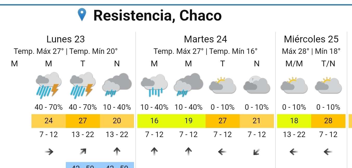 El sistema de alerta temprana del SMN ubica a Resistencia y gran parte del Chaco bajo nivel amarillo, lo que implica «fenómenos meteorológicos con capacidad de daño y riesgo de interrupción momentánea de actividades cotidianas».
