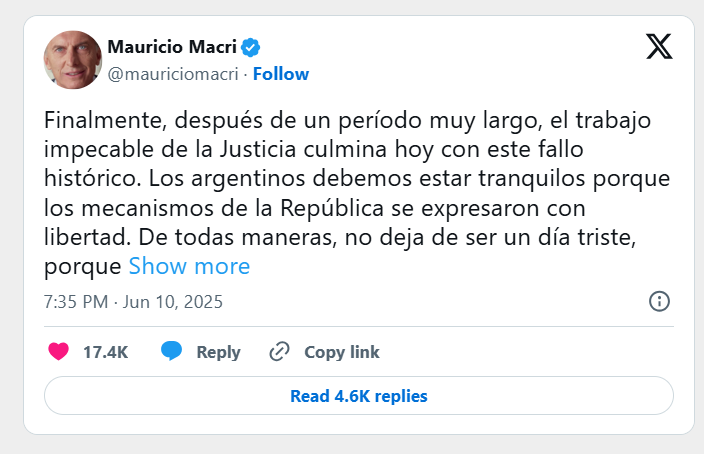 «Los argentinos debemos estar tranquilos porque los mecanismos de la República se expresaron con libertad. De todas maneras, no deja de ser un día triste, porque ver a una expresidenta condenada por corrupción, sabiendo de la destrucción que eso significó para el país, no nos da motivos para celebrar nada», expresó en su cuenta de X.