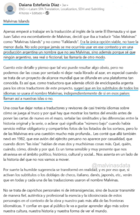 Daiana Estefanía Díaz, quien estuvo a cargo de los subtítulos de la serie El Eternauta, explicó su decisión de traducir «Islas Malvinas» como «Malvinas Islands» en inglés, descartando el uso de «Falklands».