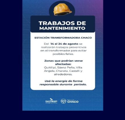 Desde el 14 hasta el 24 de agosto, la estación estará fuera de operación debido a labores preventivas que se llevarán a cabo para evitar eventuales fallas en el transformador. Localidades como Quitilipi, Presidencia Roque Sáenz Peña, Villa Ángela, Charata, Castelli y áreas circundantes podrían verse afectadas.
