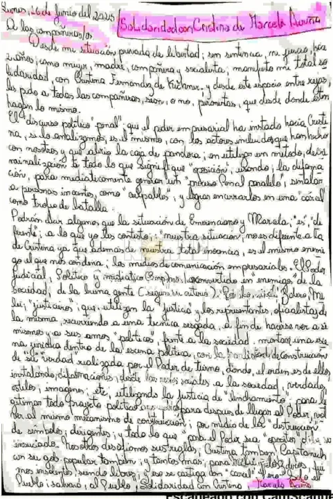 Hago pública una carta escrita por mi hna. Marcela Verónica Acuña. Privada de libertad Preventivamente en la Penitenciaria de Mujeres del Barrio Don Santiago, solidarizándose con nuestra ex Presidenta Cristina Fernández de Kirchner.