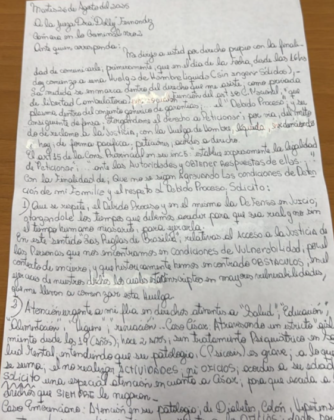 “Qué mi hijo César Sena, tenga acceso a un tratamiento continuo psiquiátrico y psicológico, como el acceso real a la Salud, Educación y recreación conforme a su edad de veintiun (21) años” ya que “desde los 19 se halla sin acceso a ningún derecho”.