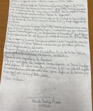 “Por todos estos motivos, hoy martes 26 de Agosto me declaro en huelga de hambre (sin sólidos), entendiendo que los pedidos son conforme a Derecho y que el reclamo por esta vía, es la expresión no solo pacífica del mismo, sino testimonio e entrega, de amor, verdad y sobre todo justicia”, concluye.