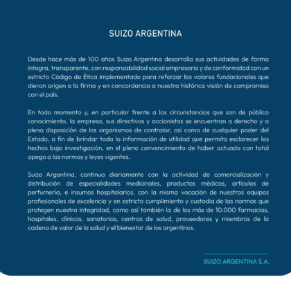 El comunicado afirma que «la empresa, sus directivos y accionistas se encuentran a derecho y a plena disposición de los organismos de contralor, así como de cualquier poder del Estado». También expresa su «pleno convencimiento de haber actuado con total apego a las normas y leyes vigentes» y finaliza el texto reafirmando su «compromiso con el país» y el «estricto cumplimiento y custodia de las normas que protegen nuestra integridad».