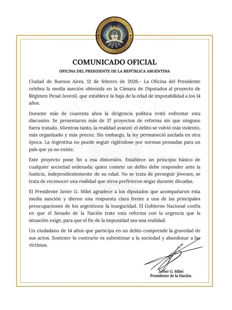 El comunicado remarca que la reforma no persigue a los jóvenes, sino que reconoce la responsabilidad de quienes cometen delitos graves y asegura que las víctimas tengan justicia. Javier Milei agradeció a los legisladores que apoyaron la media sanción y solicitó que el Senado trate la iniciativa con urgencia, para que “el fin de la impunidad sea una realidad”.